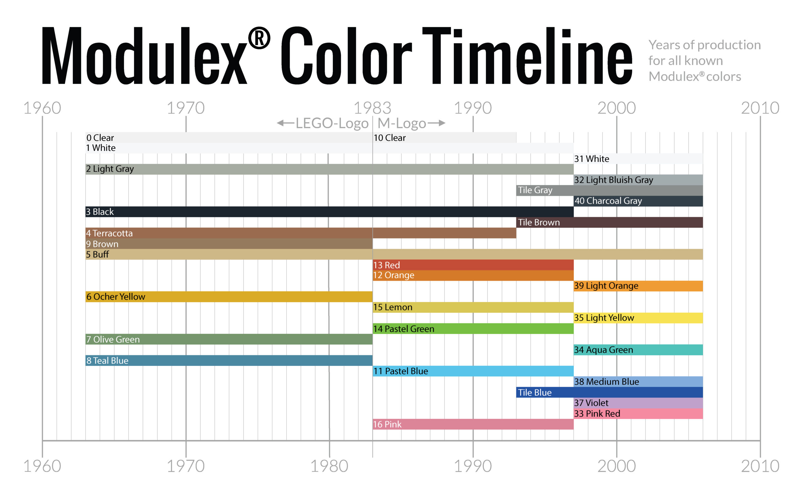 Note that many of these dates are best-guess estimates, especially the more recent ones. It’s surprisingly difficult to find concrete information about the history of Modulex.
