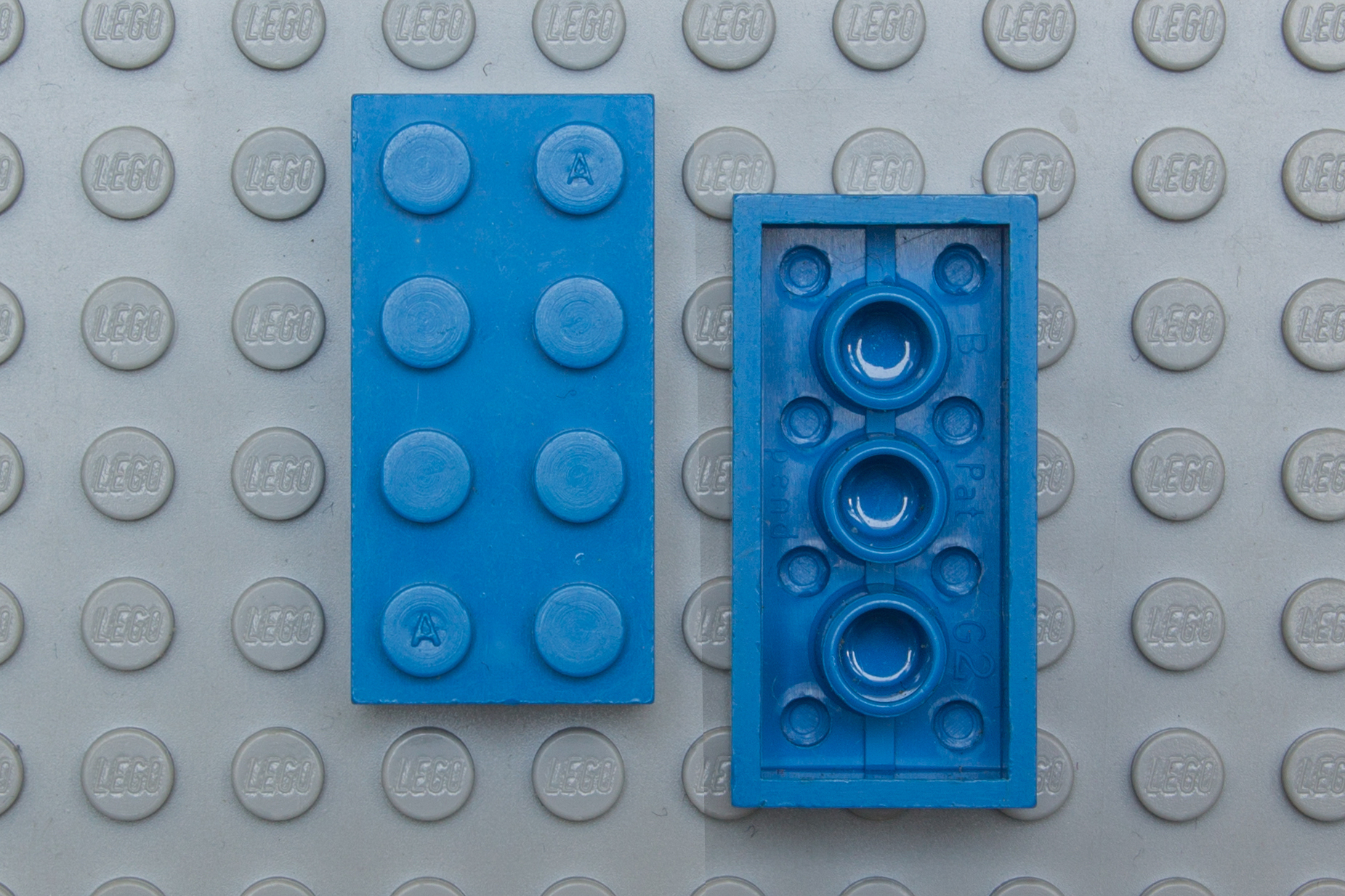 - A small capital letter on the top right and bottom left studs, the other studs are blank.