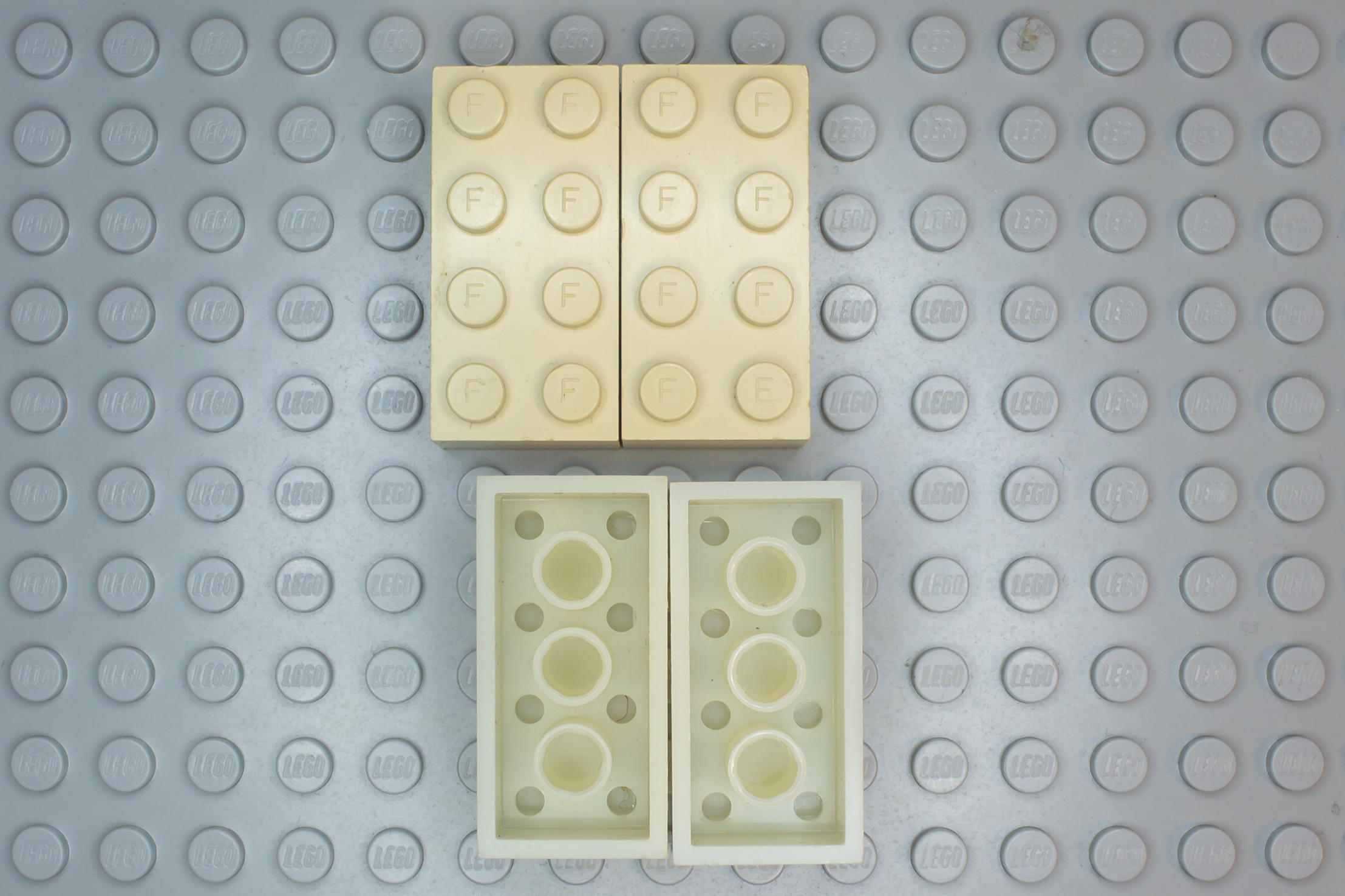 Mold pip: centered on tle long side. The 8xF brick has the pip on the right side, the 8xF+E brick on the left side.
