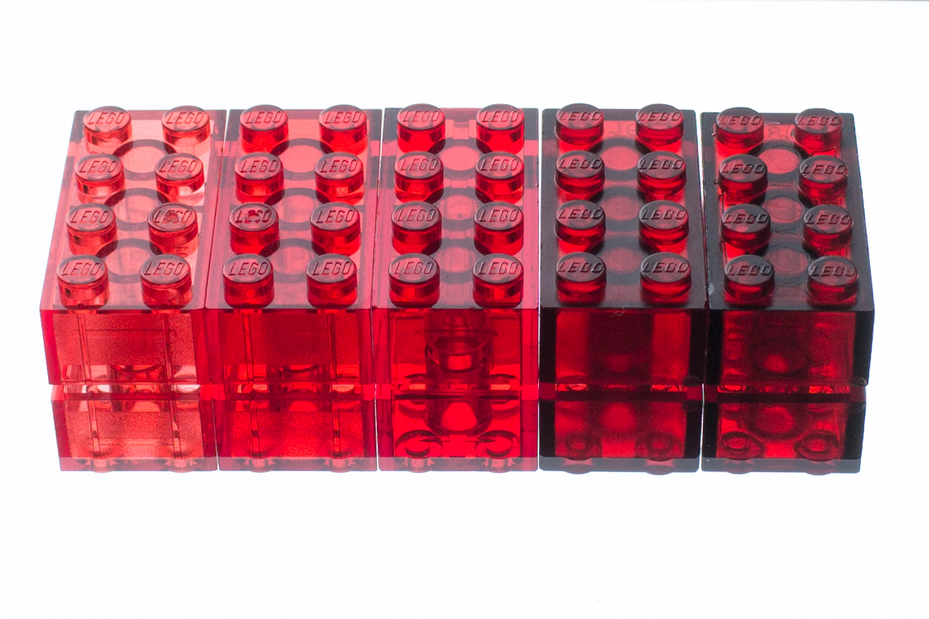 - LEGO brick, mold number 3 with cross-support and thick walls. Looking a bit darker than the brick on its left because of the wall thickness.