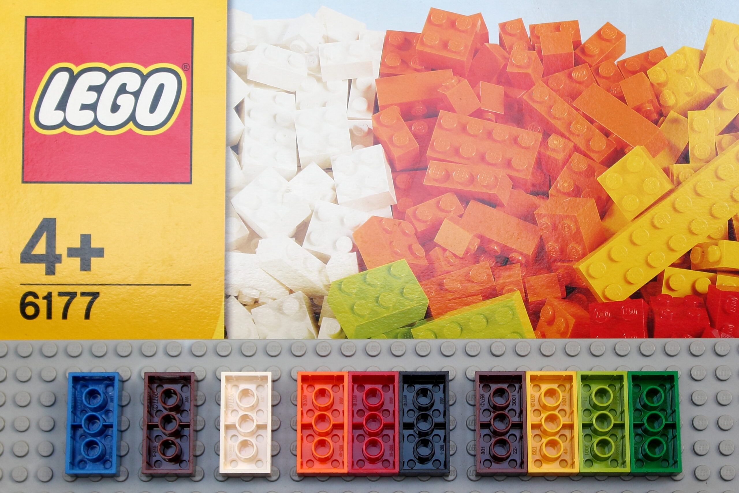 This photo shows the 2×4 bricks I found in set 6177, first released in 2008 but bought on discount in 2013 or 2014 in the Netherlands. The bags containing the parts are marked with (C) 2011, but the same print is found on bags found in set 10682 in 2015. The best production date I can determine is “between 2011 and 2014”.
