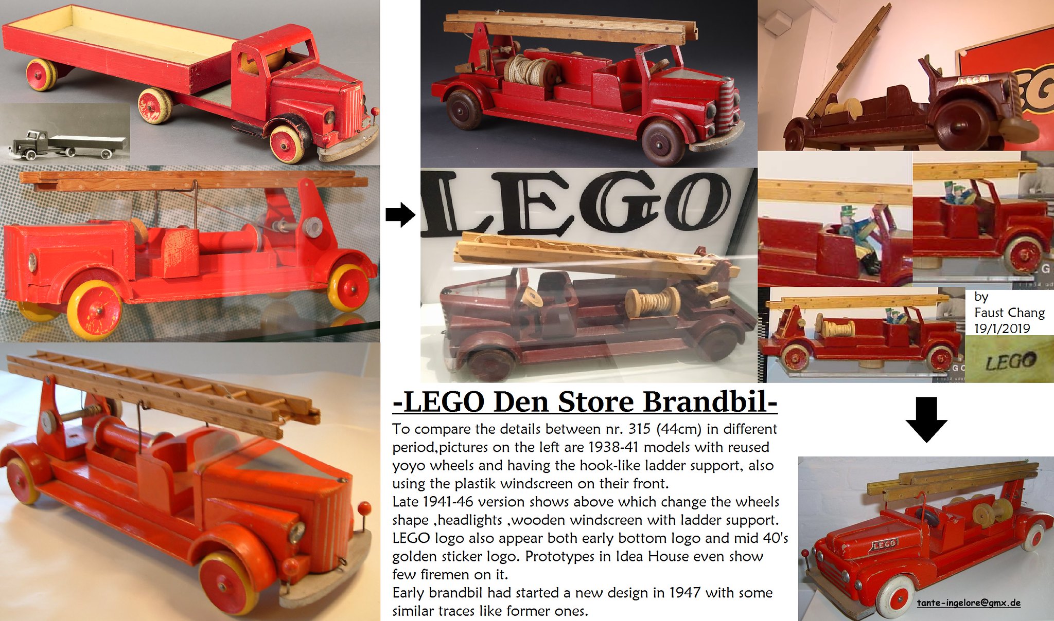 The late 1941-46 version shows above which change the wheels shape, headlights, wooden windscreen with ladder support. The LEGO logo also appears, both early bottom logo and mid 40s golden sticker logo. Prototypes in Idea House even show a few firemen on it.