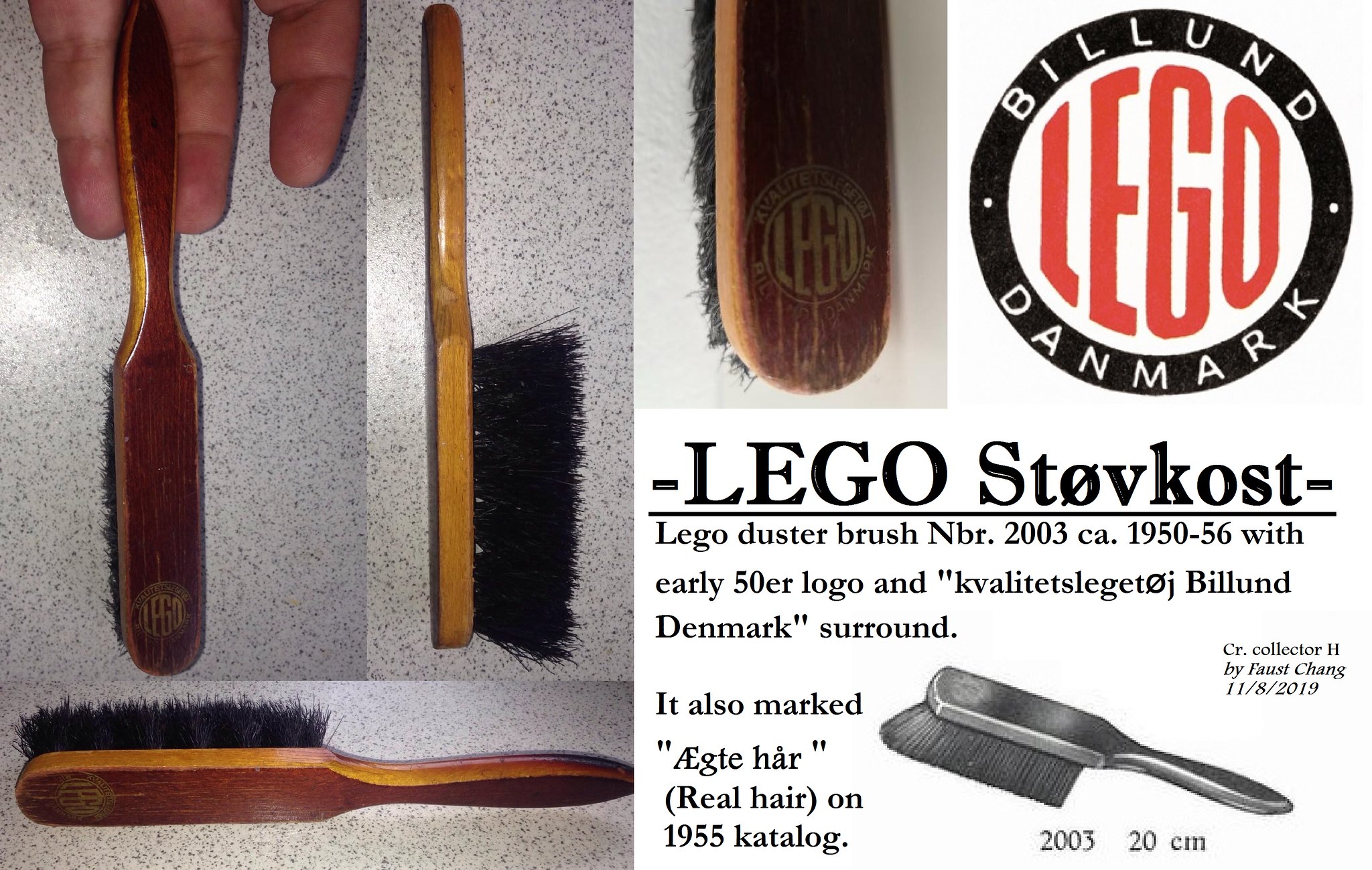LEGO duster brush nr. 2003 ca. 1950-56 with early 50s logo and “kvalitetslegetøj Billund Denmark” surround.