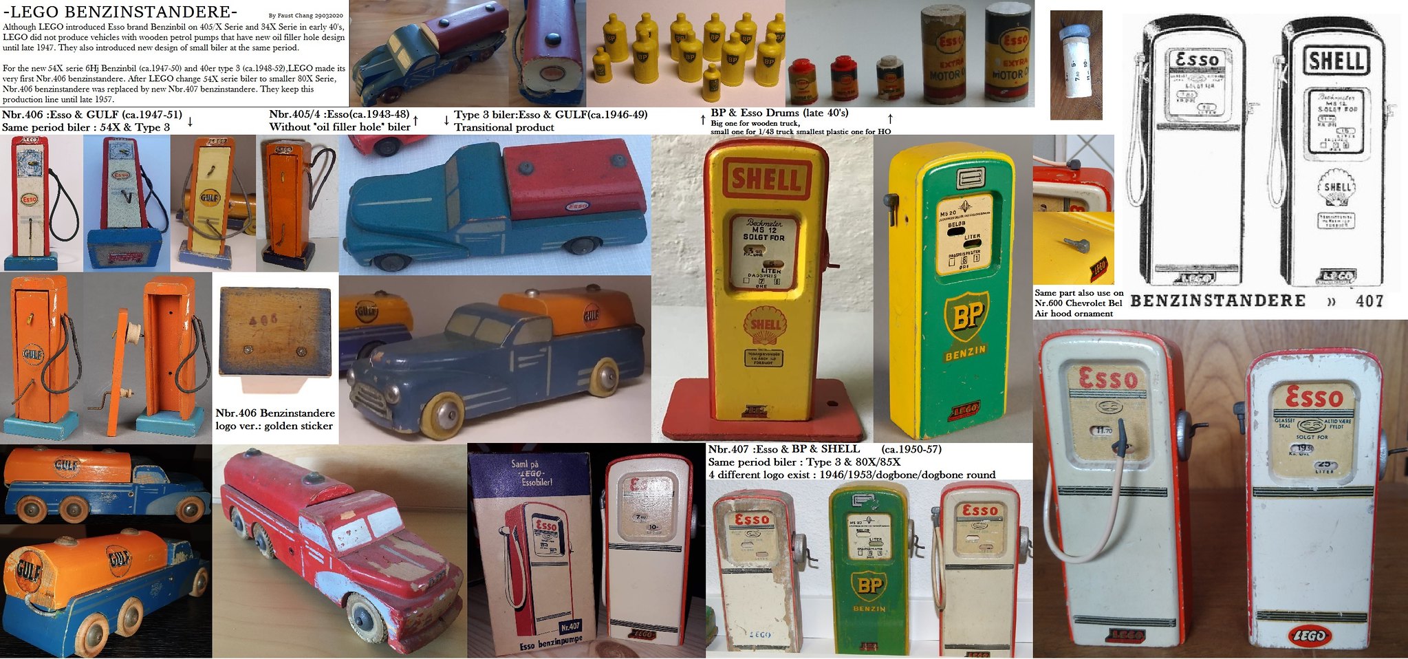 Although LEGO introduced Esso brand Benzinbil on 405 X Serie and 84X Serie in early 40.s, LEGO did not produce vehicles with wooden petrol pumps that have new oil filler hole design until late 1947. They also introduced nesv design of small biler at the same period.