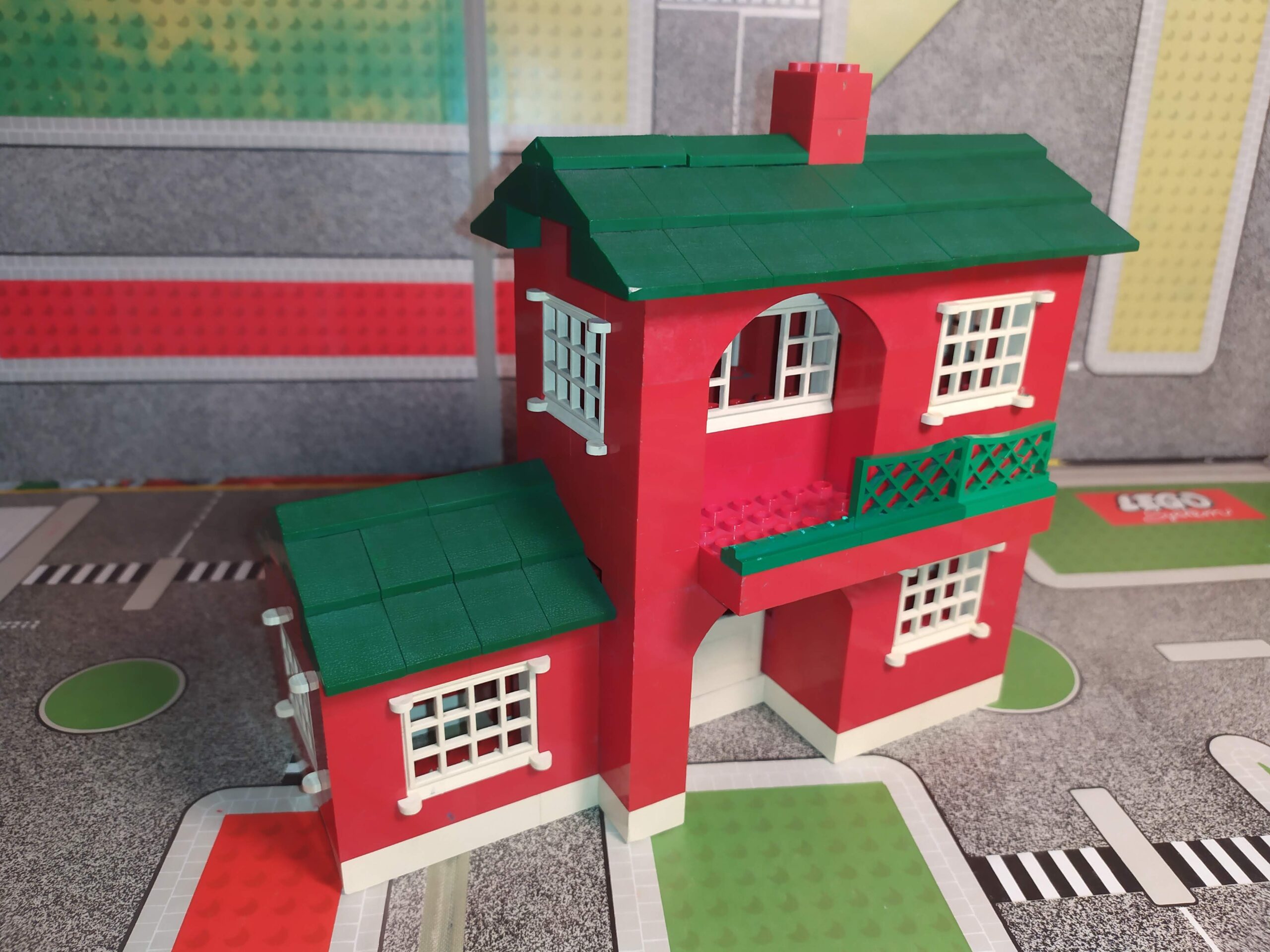 All the bricks (2×2, 2×4, arches) are OLO, while windows, the door and the roof slopes (only 2×3 which is weird) seem to be regular Minitalia parts. Judging from some color residue, it seems that originally the model also had shutters on the two front right windows (just like the model on the box of set #4).