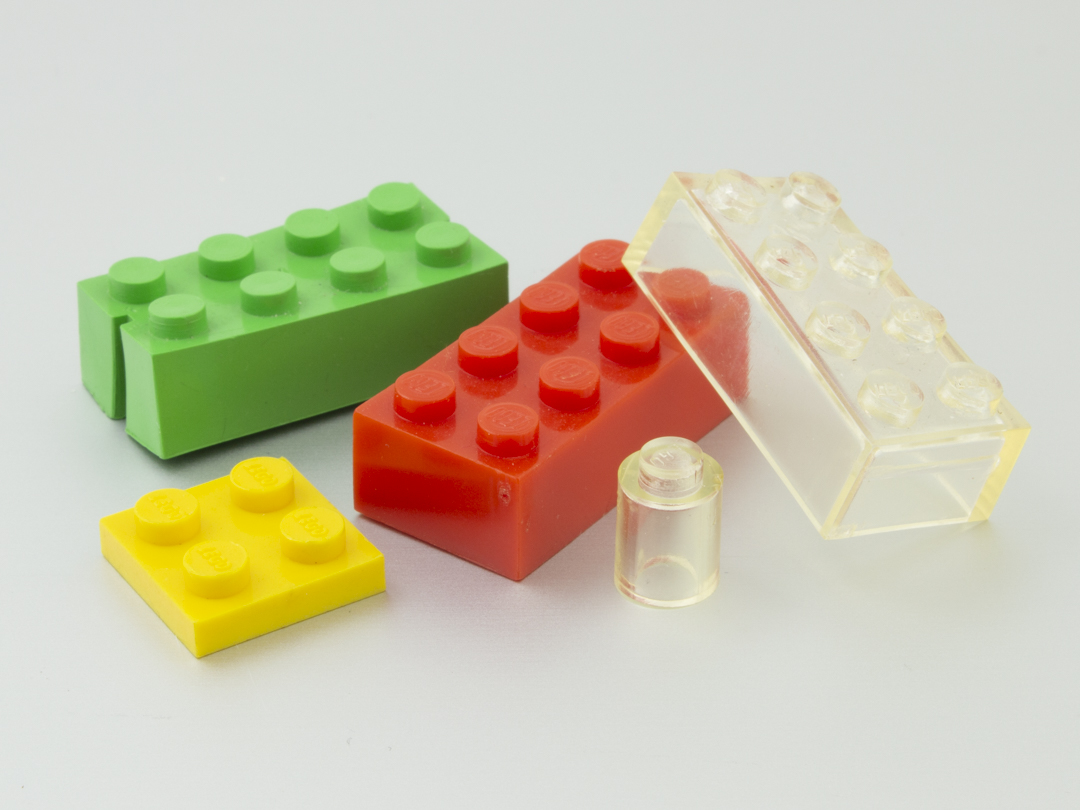 CA is a moderately hard thermoplastic (a plastic that softens when heated and hardens when cooled). It can have very glossy, vibrant coloration, and good transparency, but it doesn’t hold its color over time as well as other plastics. Most (all?) LEGO CA was Bayer’s Cellidor. The very first LEGO bricks in 1949 were made from CA, and this use continued through the Town Plan and Samsonite eras. However, over time CA has a tendency to warp, often severely. Many of these bricks are now incompatible with modern bricks due to this deformation. LEGO switched to ABS around 1963, and fully phased CA out by 1970, with Samsonite in the USA as the last holdout.